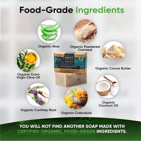 💦Ultimate Eczema Therapy Bar Ingredients (All Food-Grade): organic extra virgin olive oil, organic coconut oil, water, organic cocoa butter, sodium hydroxide*, organic castor oil, organic powdered oatmeal, organic aloe vera, organic comfrey root, organic calendula (marigold). Â