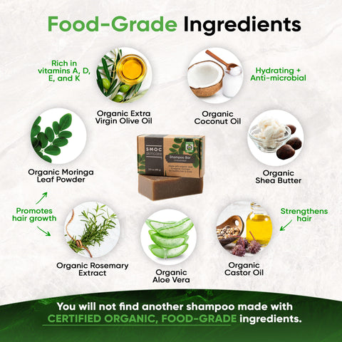 🌿Ingredients (All Food-Grade): organic extra virgin olive oil, organic coconut oil, water, organic shea butter, sodium hydroxide*, organic castor oil, organic moringa leaf powder, organic aloe vera, organic rosemary flower extract.
